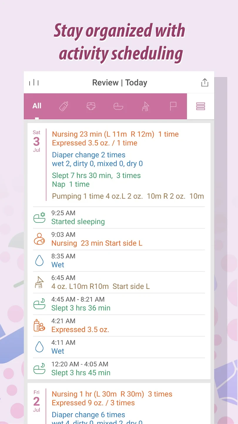 A: By consistently logging activities like sleep, feeding, and diaper changes, the app helps your baby’s information build over time. You can visually see patterns emerge – perhaps your baby is hungrier at certain times of the day, needs a nap soon after feedings, or has consistent sleep cycles. This organized view simplifies interpretation and helps identify cues faster than memory alone.