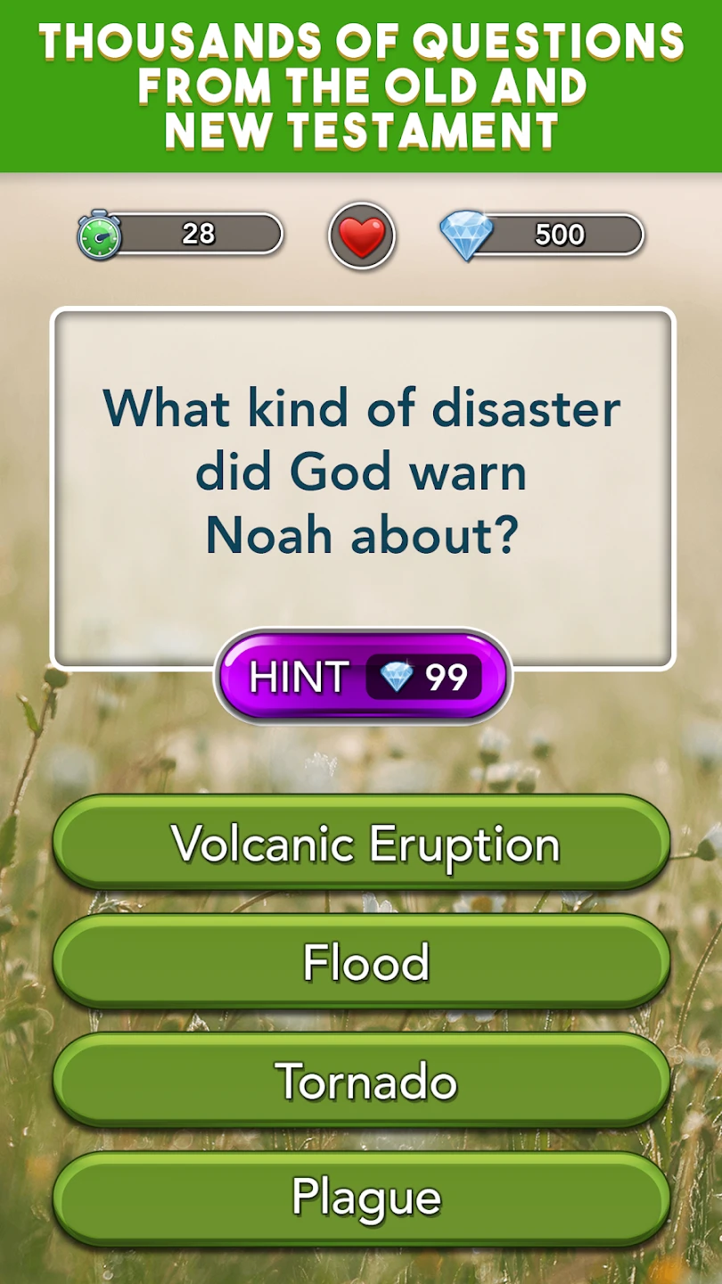 • [Core Gameplay Loop]: The main mechanic revolves around daily trivia questions presented as multiple-choice prompts, often featuring Bible verses or historical facts. Players select the correct answer, and their score increases accordingly. The objective is to achieve the highest score possible each day, encouraging regular engagement to improve recall and understanding.