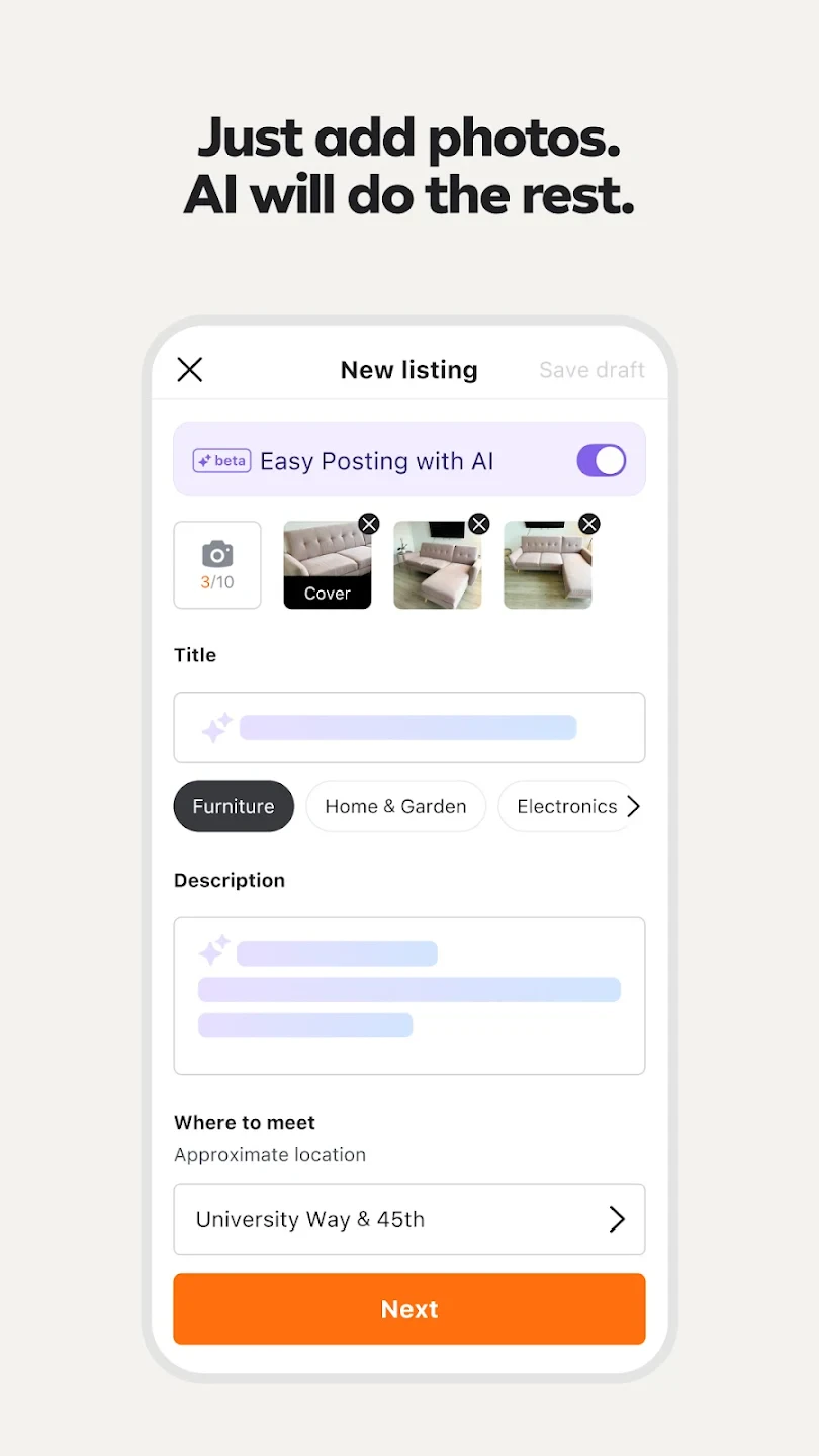 • Sell Your Items with Photos and Descriptions: Users can take clear photos of their items, provide detailed descriptions mentioning any flaws, and set a price. This feature ensures potential buyers have all necessary information to make informed decisions, reducing misunderstandings and promoting fair transactions.