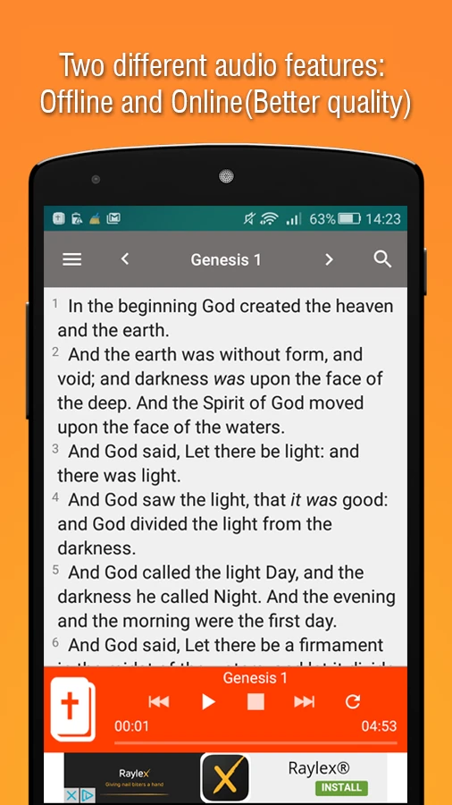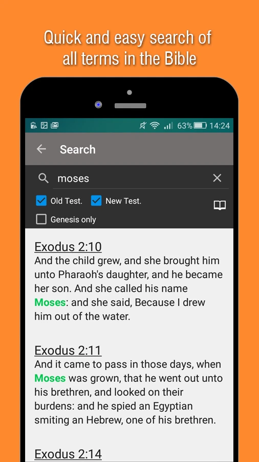 • Complete Offline Content: Instantly access the entire King James Version without downloads or data usage. This eliminates interruptions, letting you read during commutes or in locations with limited access.