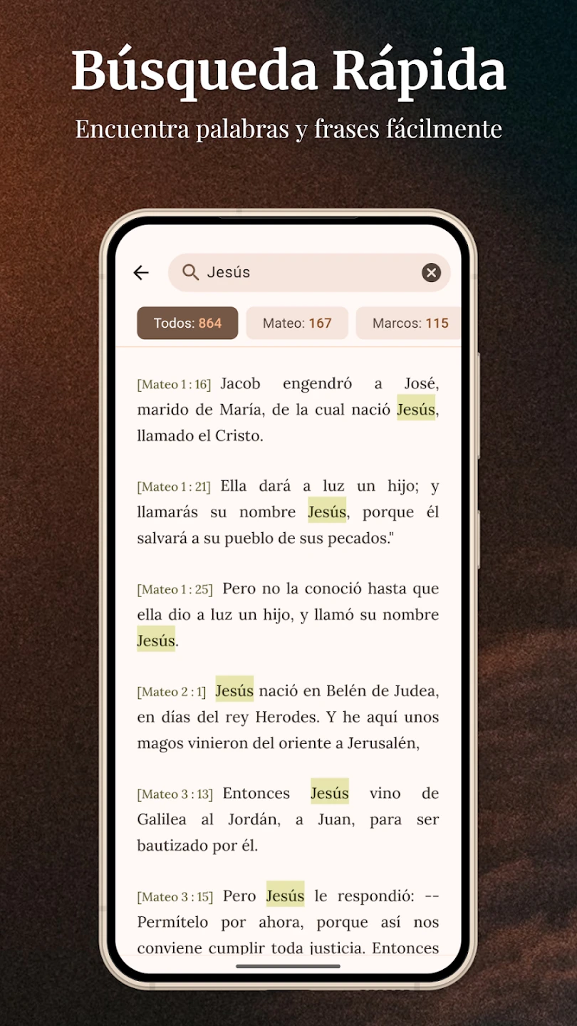 • Bible Concordance: Search for specific verses across all translations and bookmark valuable passages for later reference or sharing. Its powerful searching capability streamlines research, allowing users to quickly locate relevant verses for answering questions, preparing sermons, or understanding complex themes, significantly saving time and deepening comprehension.
