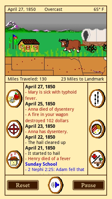 - Core Gameplay Loop: Players guide a wagon train through different seasons and terrains, collecting supplies, managing group health and energy, and making strategic decisions at milestones. The objective is reaching Utah safely, with resource management directly affecting survival chances and success rate.