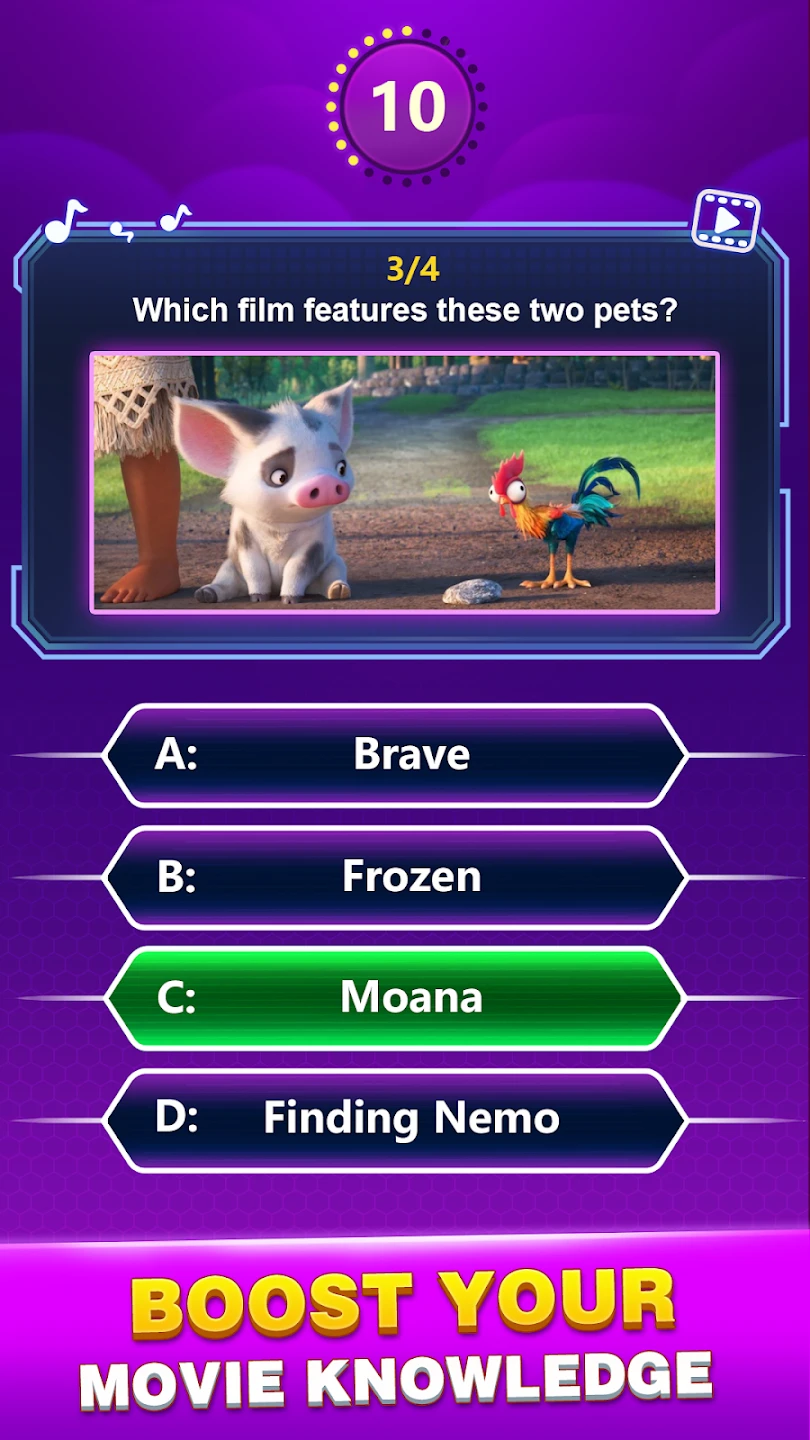 - [Core Gameplay Loop]: Players answer movie-related questions presented as multiple-choice options. Each correct answer earns points, while incorrect choices penalize the score, adding a competitive element to test both knowledge and speed.