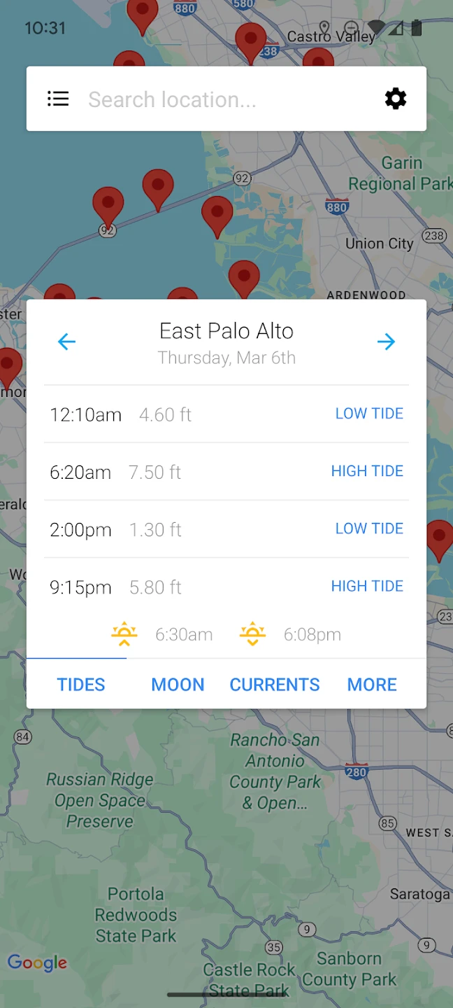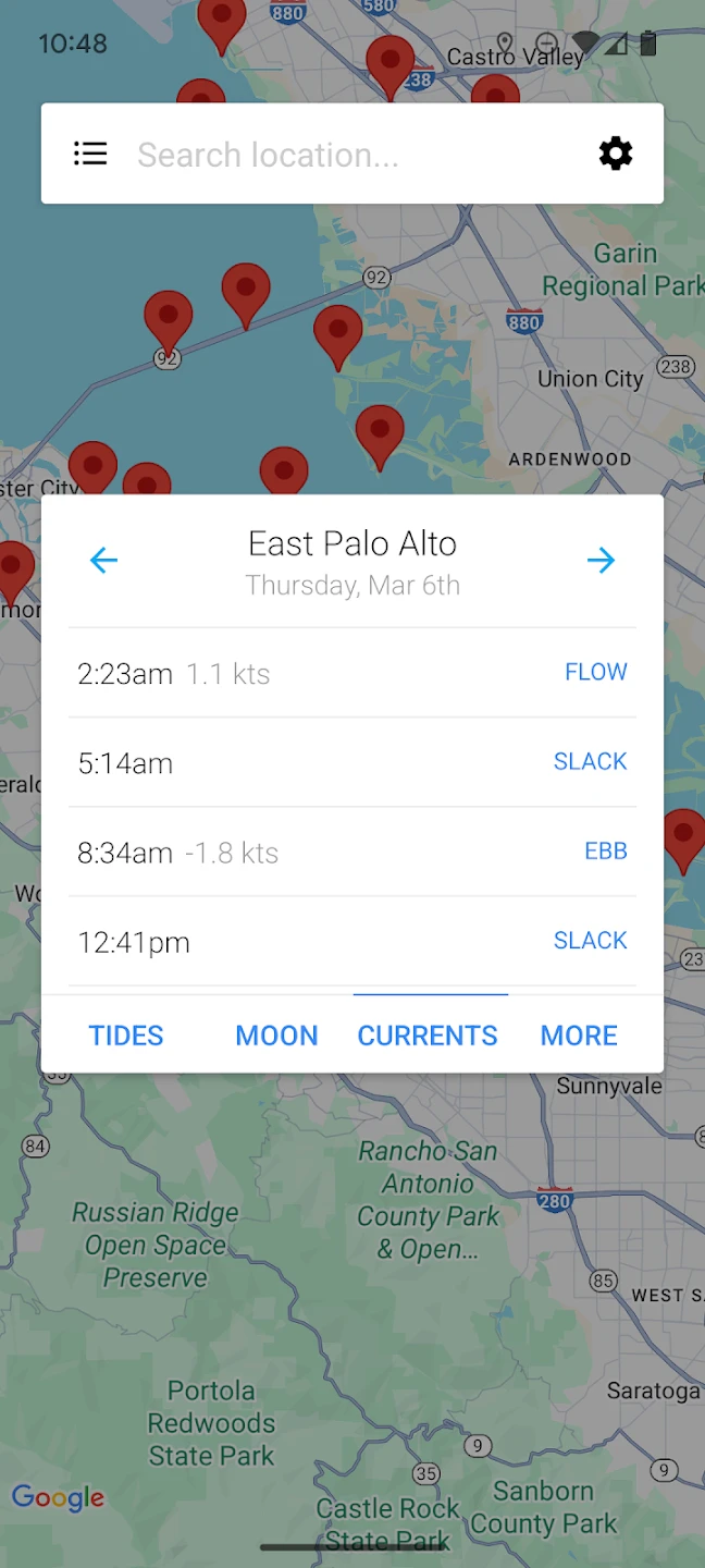 • Search Functionality & Global Data Access: The app features a robust search tool allowing users to find locations globally and easily access tide charts and predictions for virtually any coastal area, ensuring reliable information for travel or exploration worldwide. It highlights key locations and offers quick access to tide predictions for your next trip.Find tides for any location on Earth instantly using a powerful search.
