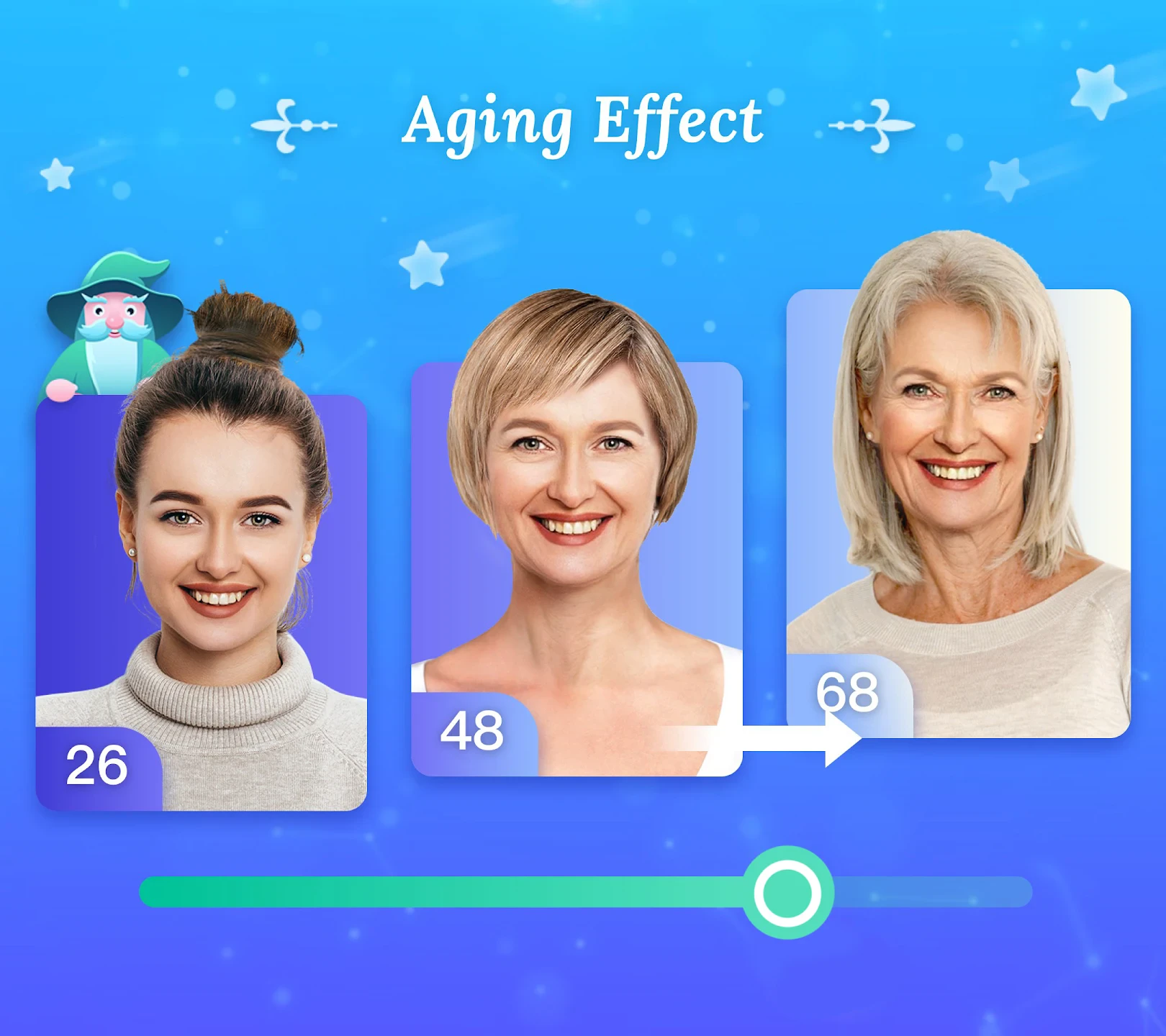 • Multiple Aging Effects: Transform photos into different ages with smooth transitions, letting users see how their images age over decades. This feature is especially useful for historical storytelling or creative aging projects, providing a visually compelling way to visualize time.