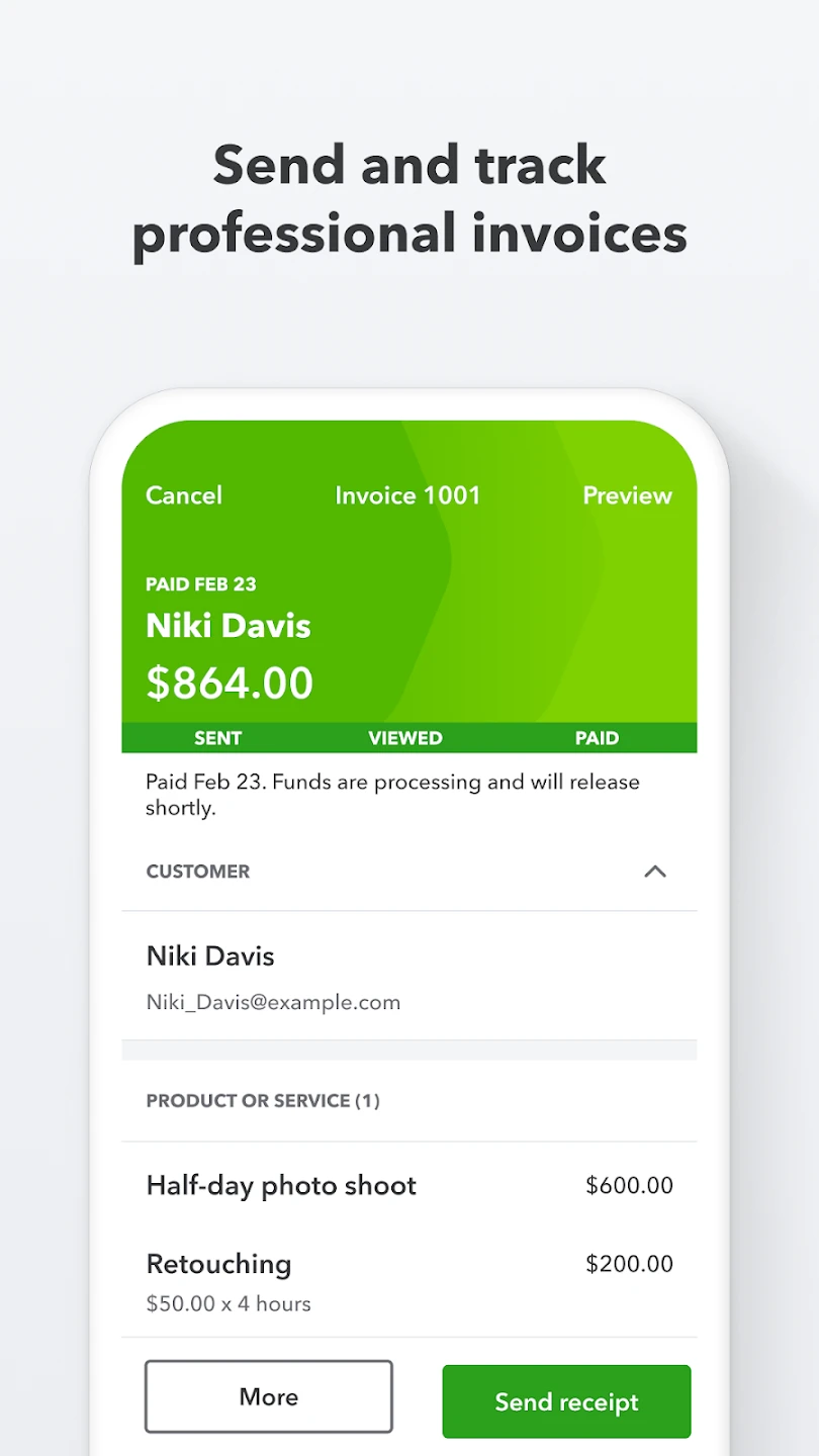 Designed for freelancers with simplified invoicing and project management tools. Emphasizes mobile accessibility.
