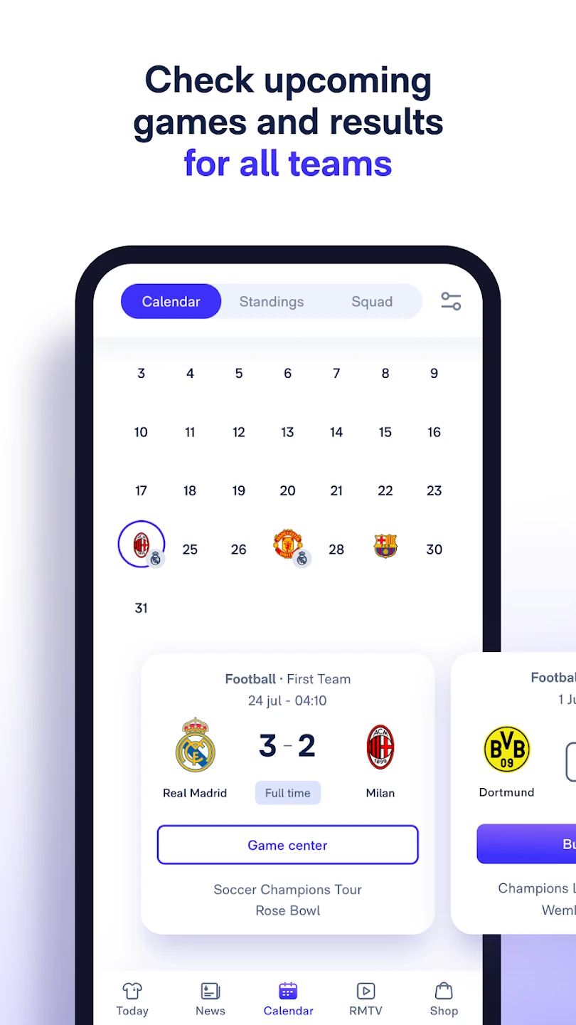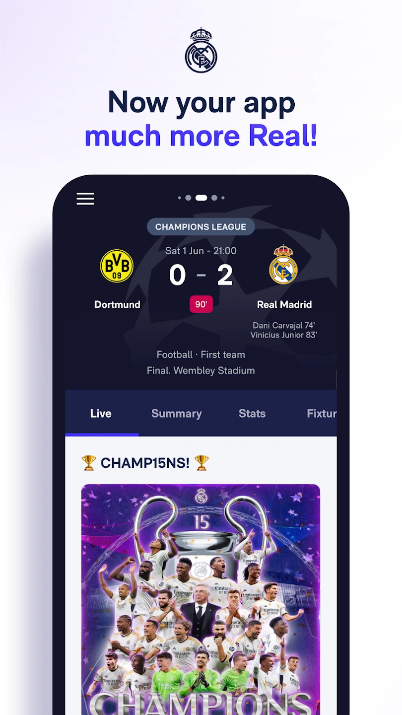 - Live Match Center: Get real-time match updates, official streaming options where available, and push notifications for crucial events during games. This keeps you informed instantly about Real Madrid’s performance on the field, helping you experience matches live even if you can’t attend them in person.