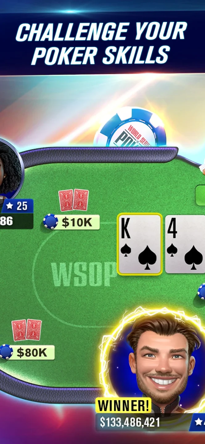 WSOP Poker: Texas Holdem Game is an immersive mobile poker simulation that puts you in the virtual seat of poker’s most prestigious tournaments. While belonging to the competitive simulation genre, this game stands out for its authentic Texas Hold’em mechanics and the thrill of competing against AI opponents with real tournament pressure.