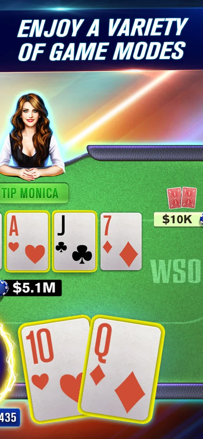 • [Modes or Levels]: Engage in Single-Player tournaments mirroring real WSOP events, Quick Games against AI opponents of varying difficulty, or Challenge Rooms. Each mode offers different stakes and objectives, providing substantial replay value through changing opponents.